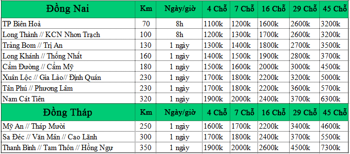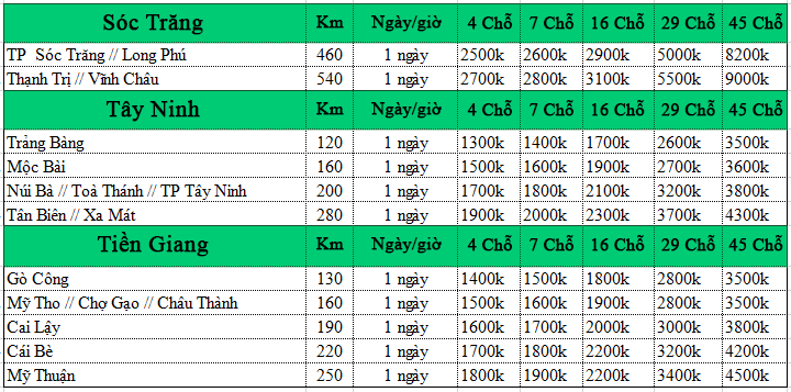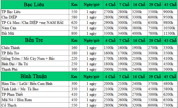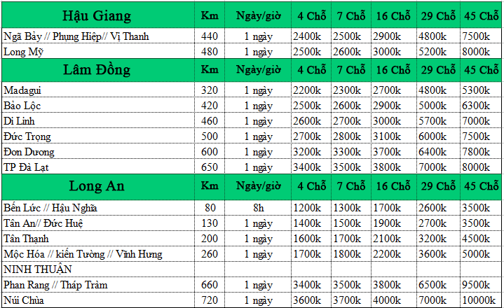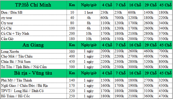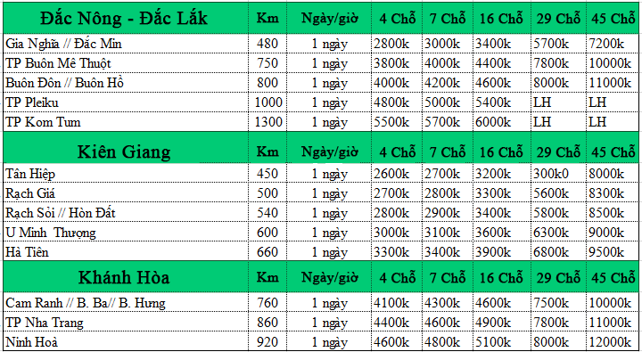 Số km sử dụng xe được tính từ thời điểm đón cho đến khi trả khách theo lịch trình. Nếu như cây số (km) khác nhau thì giá thuê xe cũng khác nhau